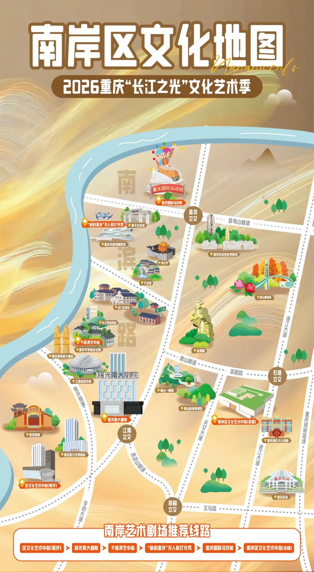 南岸区人民政府联合共青团重庆市委员会、中国东方演艺集团、重庆日报报业集团,共同主办2026重庆“长江之光”文化艺术季,以2026年4月至5月为活动集中期并延伸至全年。