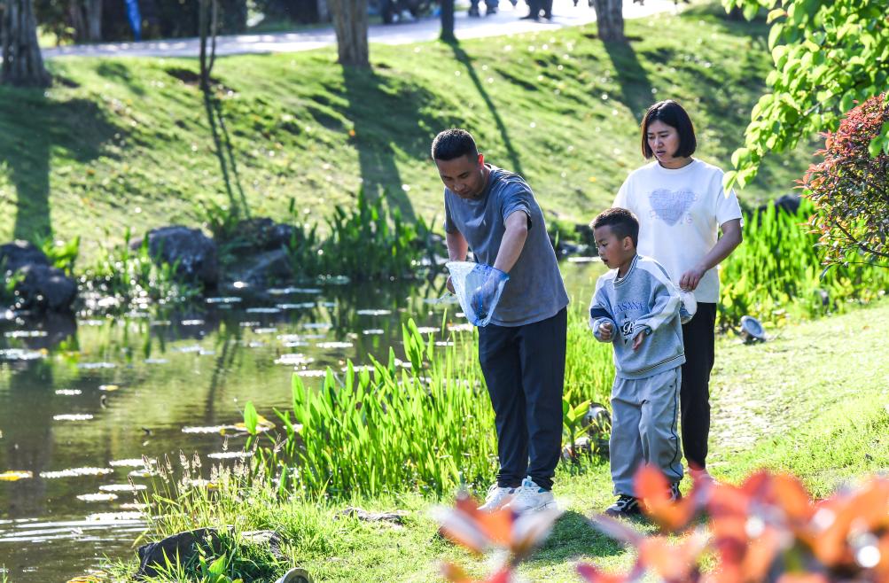 4月11日,市民游客在玉带河公园内游玩。新华社记者 唐奕 摄
