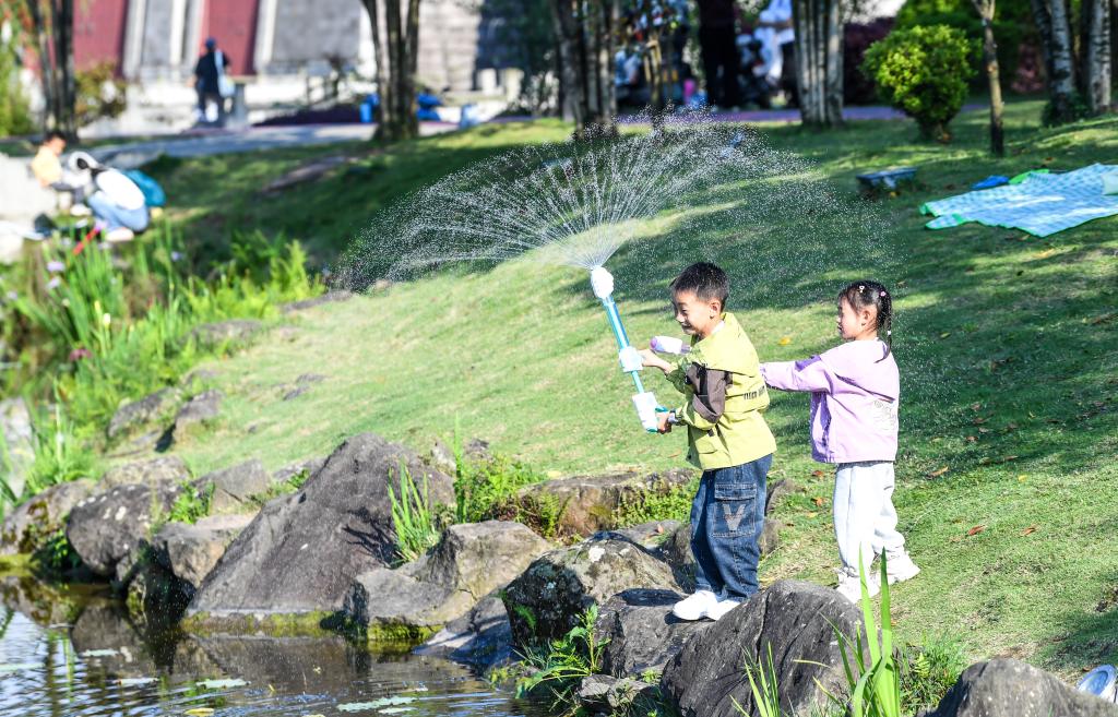 4月11日,小朋友在玉带河公园溪水边玩水。新华社记者 唐奕 摄