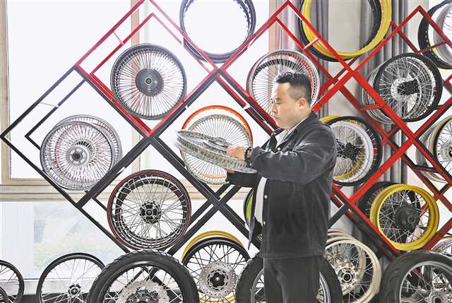 4月13日,沙坪坝区青木关镇重庆腾承机械制造有限公司生产车间,技术人员正在对一款摩托车辐条轮毂进行设计优化。该公司主要研发摩托车轮毂和轮辋等配件产品。特约摄影 孙凯芳/视觉重庆