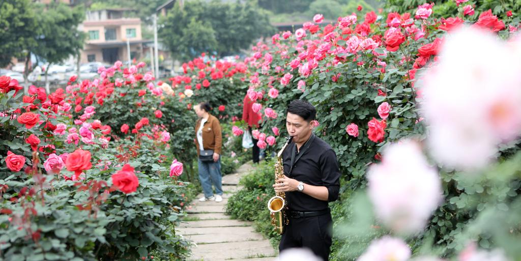 4月15日,游客在重庆市永川区三教玫瑰园演奏萨克斯。