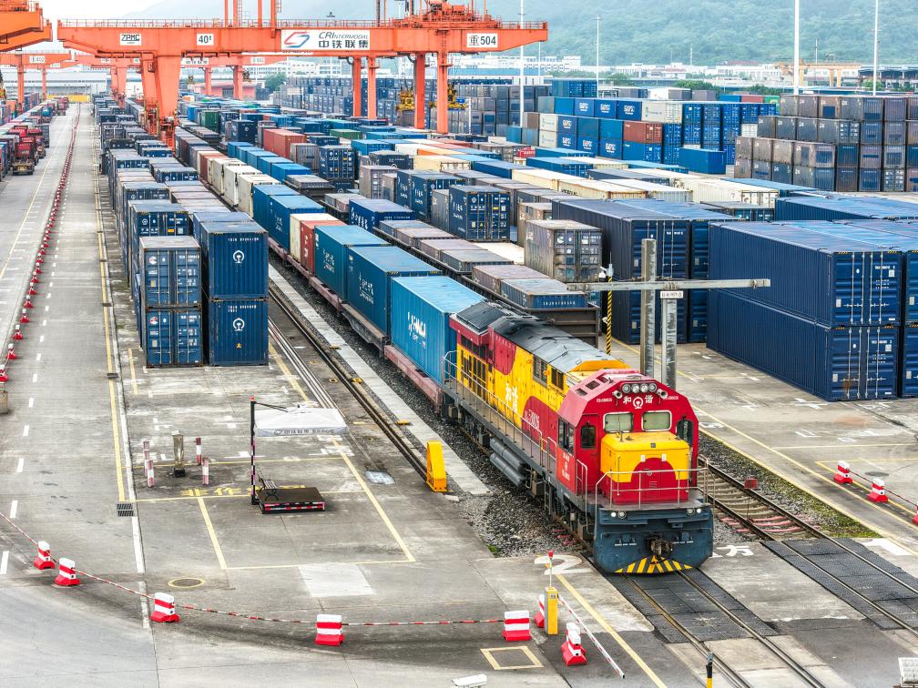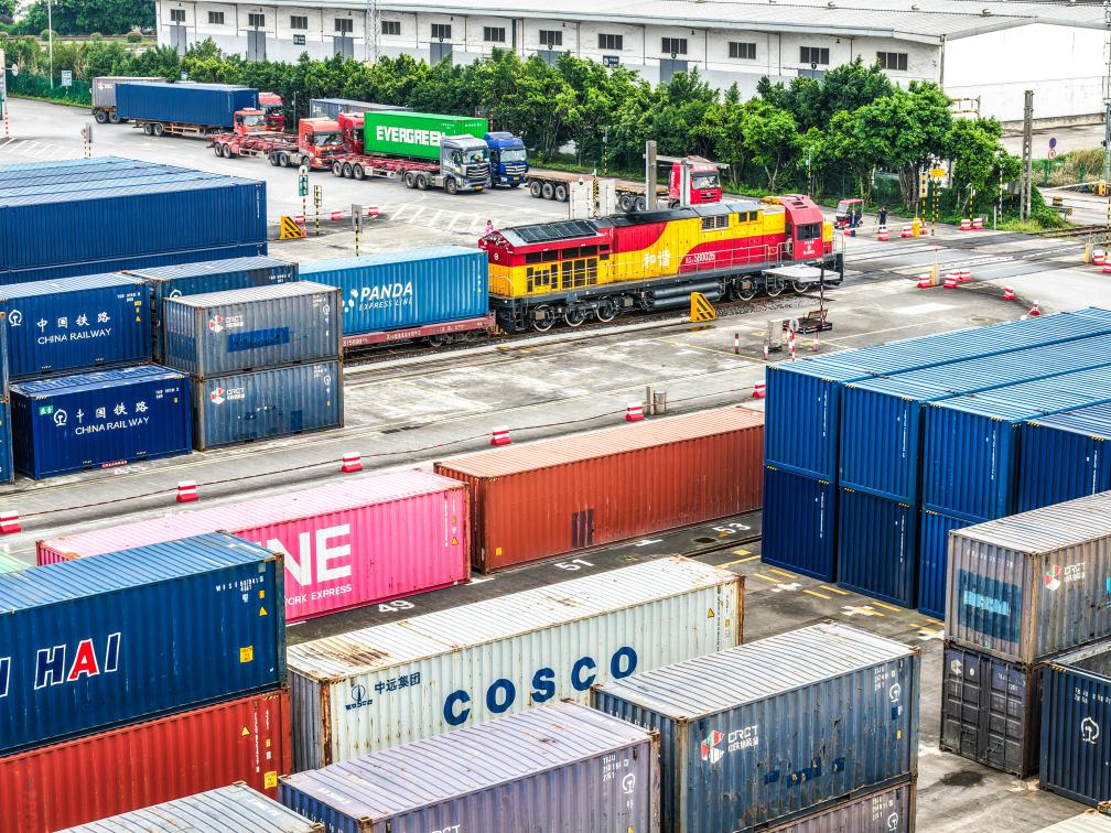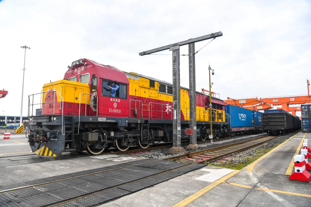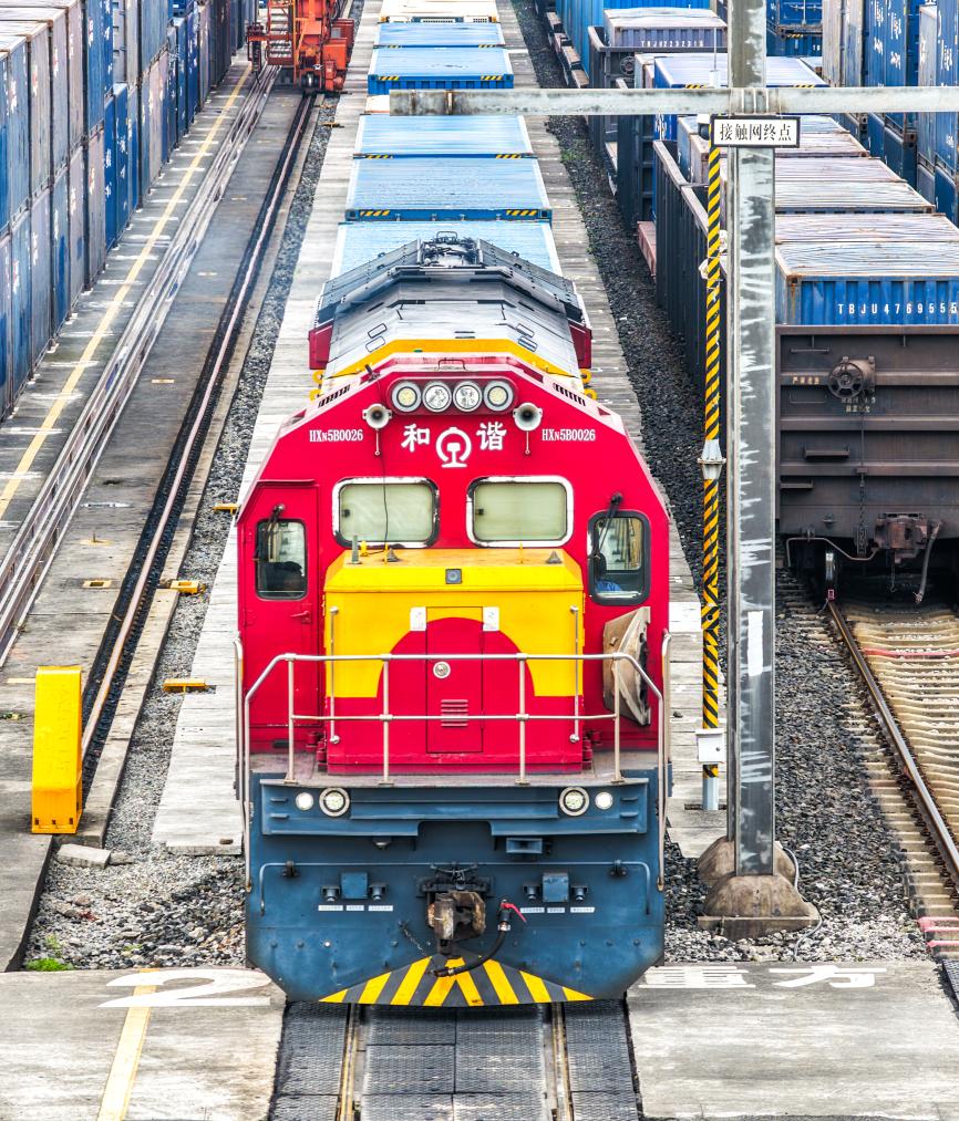 4月15日,一列满载“重庆造”新能源汽车的中老跨境班列在重庆团结村站等待发车。新华社记者 唐奕 摄