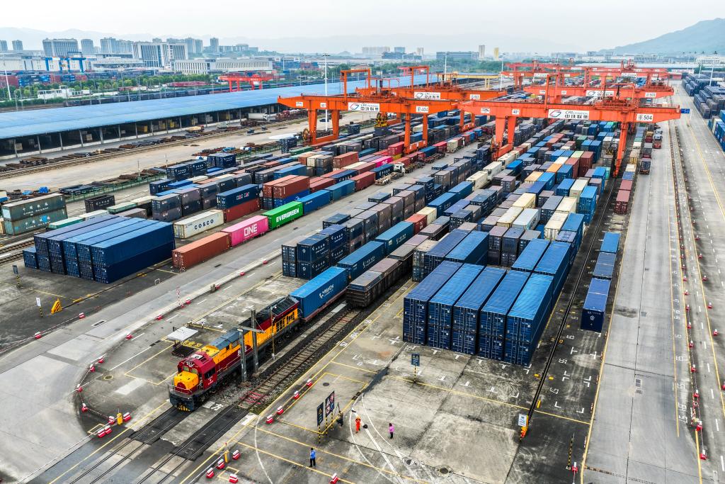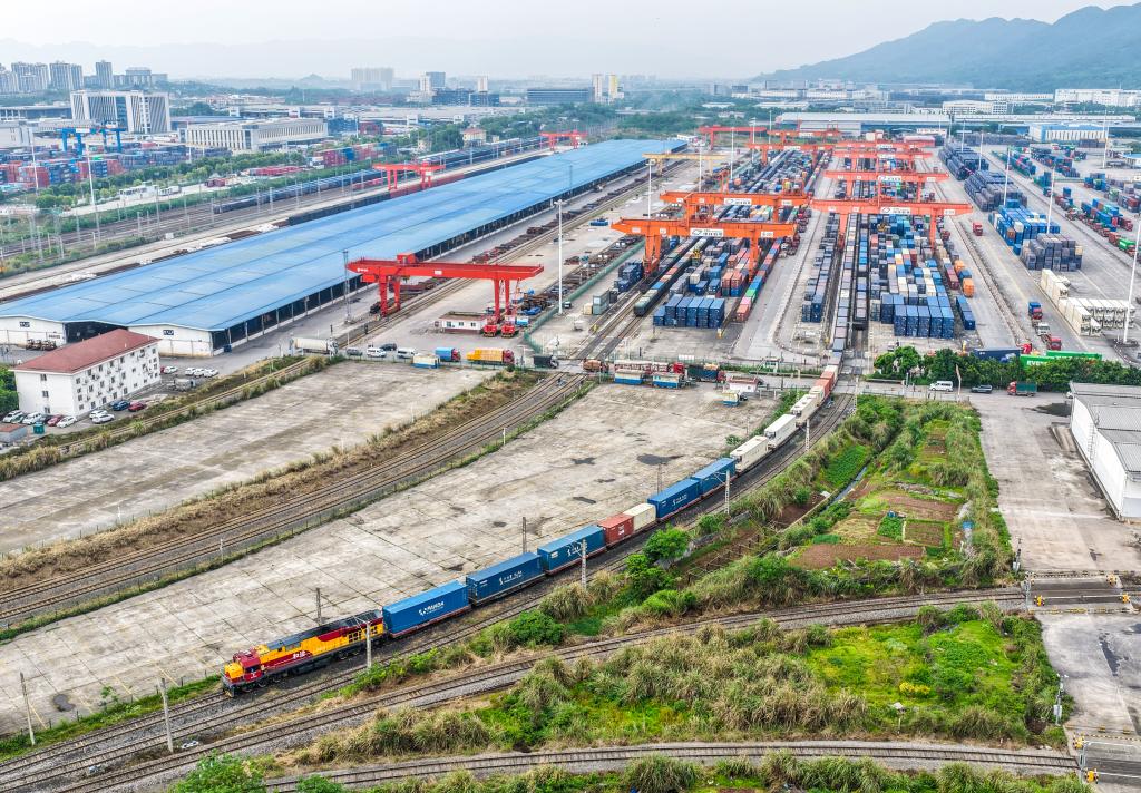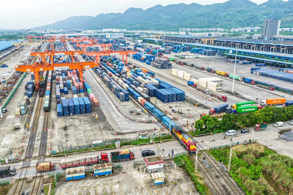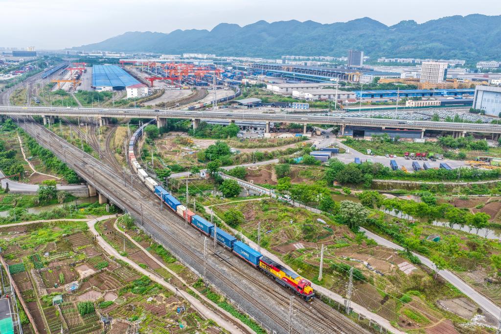 4月15日,一列满载“重庆造”新能源汽车的中老跨境班列在重庆团结村站顺利发车(无人机照片)。新华社记者 唐奕 摄