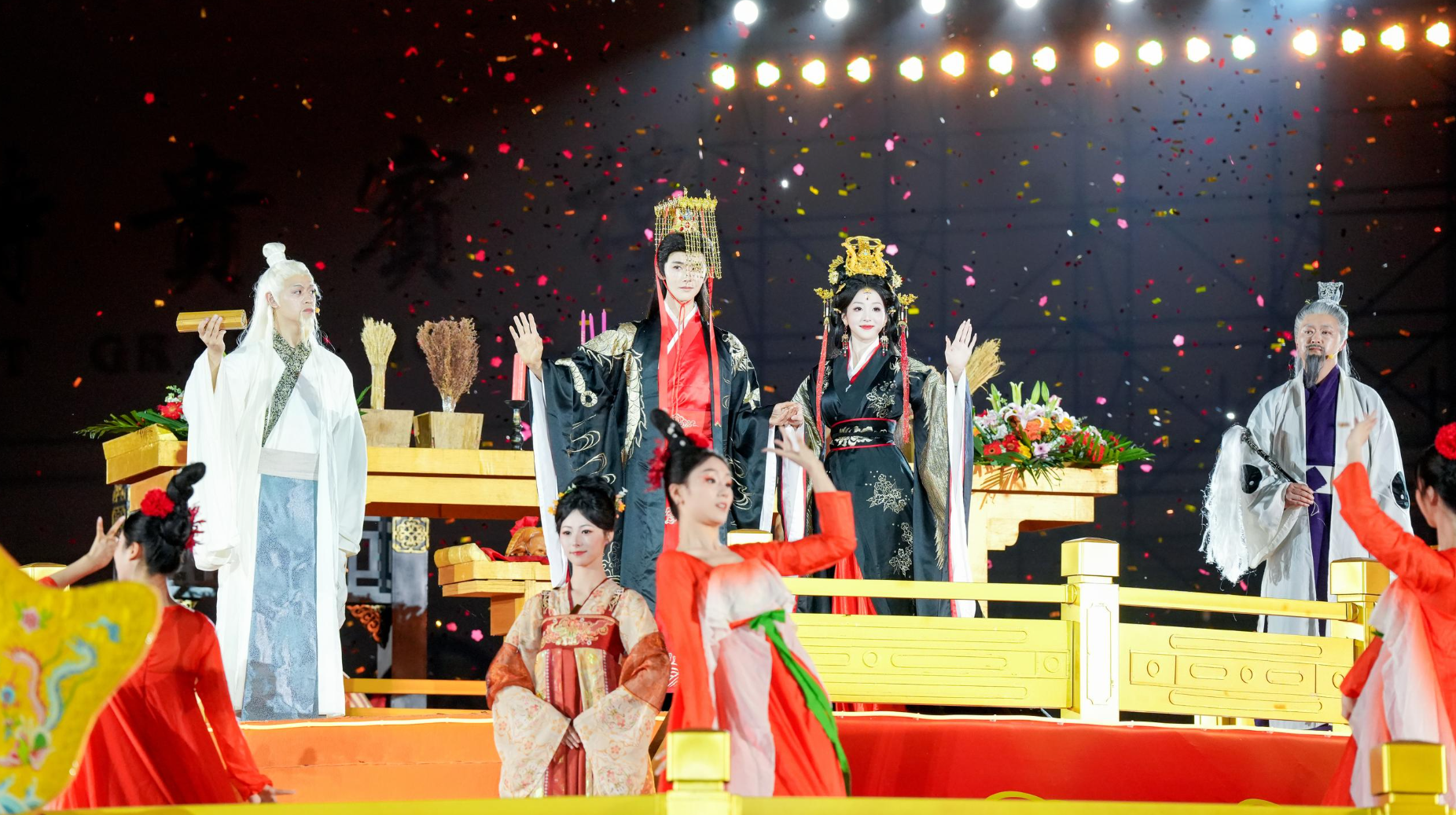 巡游启幕前,庄重的祈福仪式率先举行。在三层圆形祈福台上,依古制陈列香案贡品,旗幡飘扬。在神鼓与颂歌中,阴天子与天子娘娘登坛主祭,敬献五谷三牲,祈愿风调雨顺、国泰民安。巴人莽号、神鼓舞等古老仪礼与现代表演形式结合,传递出深厚的历史文化底蕴。