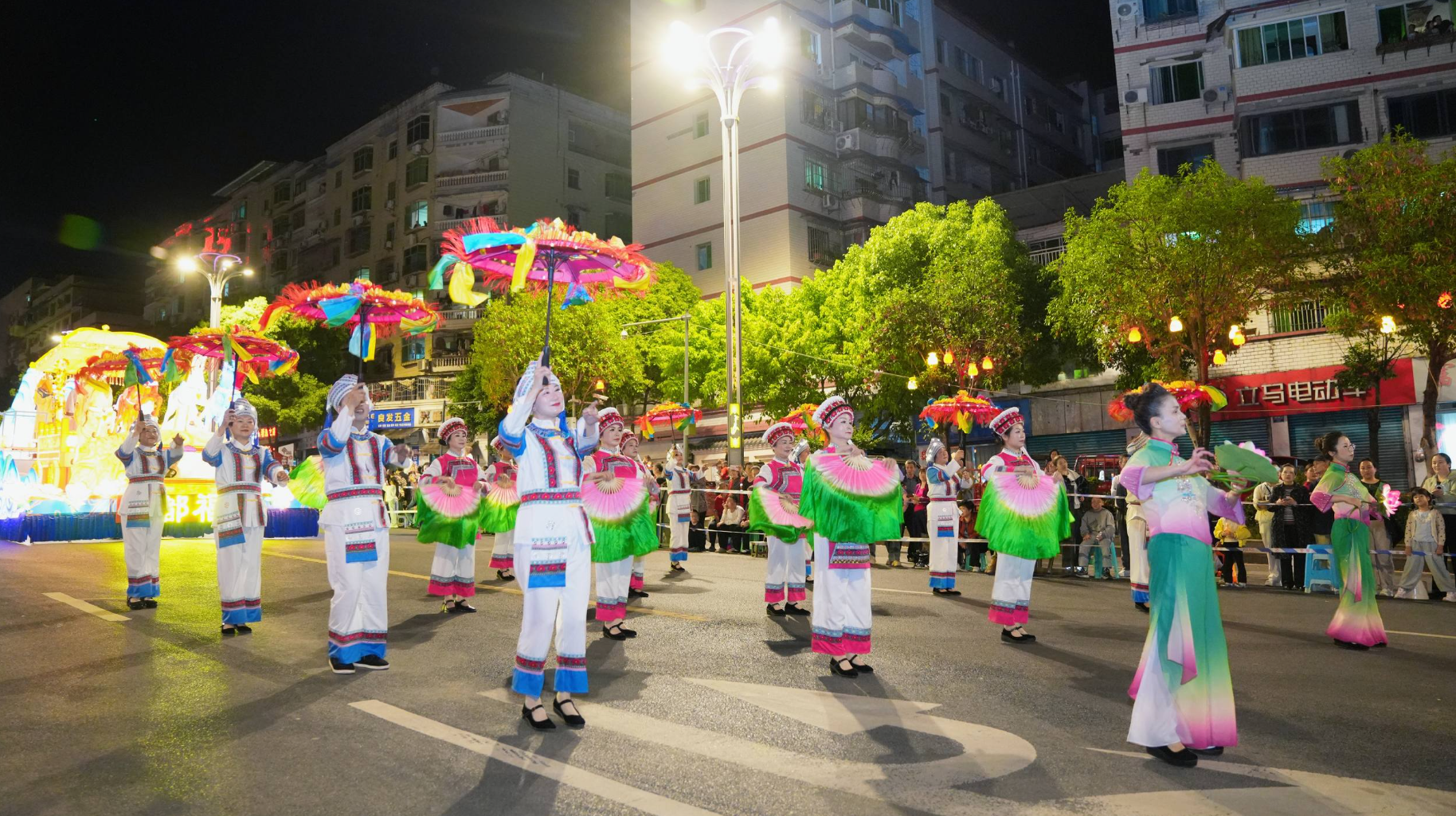 在巡游路线的重要节点,设置了精彩的驻停表演。四大银行路口,金色凤凰、蝴蝶仙子、鱼灯、国风伞舞与喷火、舞龙、变脸等表演交织,互动热烈。队伍抵达终点龙河二桥东桥头后,全民狂欢环节随即开启。热气球升空,冷焰火绽放,彩色泡沫营造出梦幻氛围,150名舞者带来潮流快闪,观众与演员携手共舞,将现场气氛推向高潮。