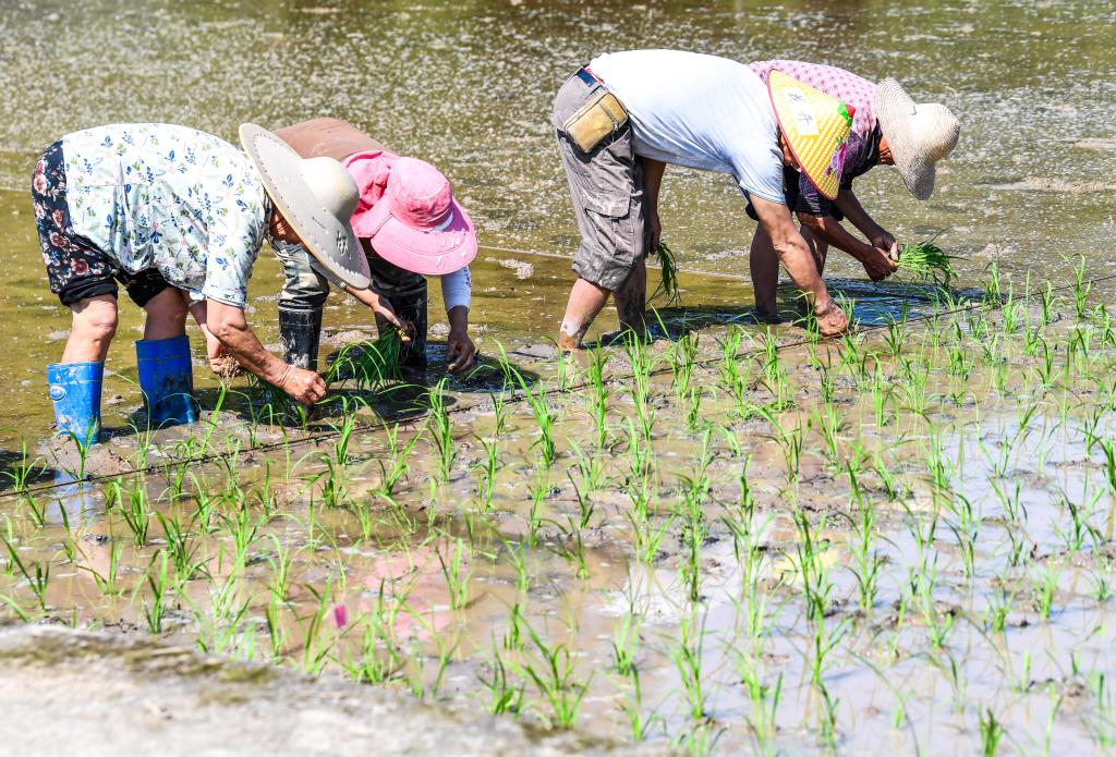 4月18日,农户在重庆市合川区渭沱镇田间插秧。新华社记者 唐奕 摄