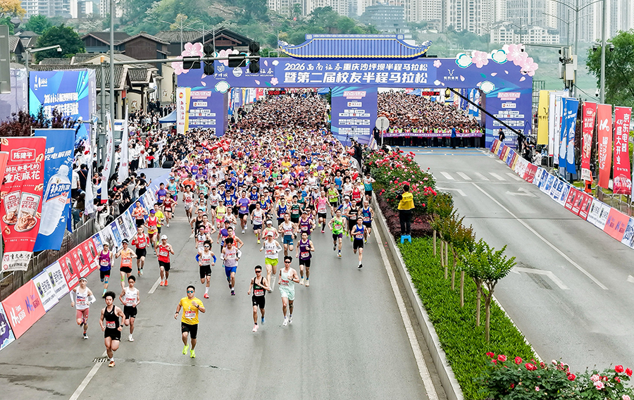 4月19日,2026重庆沙坪坝半程马拉松暨第二届校友半程马拉松在沙磁文化广场鸣枪开跑。来自全球的8000名跑友、69所学校组队参赛,共同开启一场融合体育竞技、青春记忆与巴蜀风情的春日聚会。