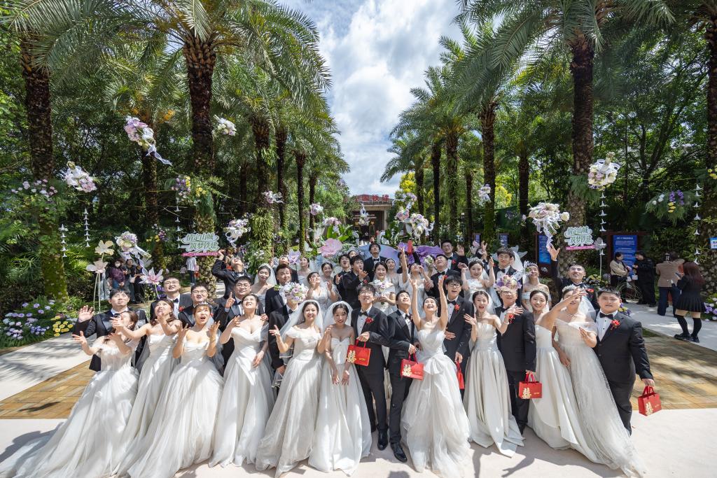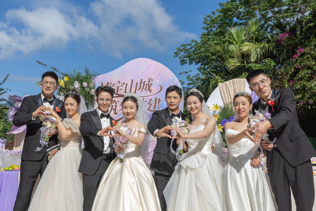 4月22日,在重庆市北碚区,参加集体婚礼的新人们在活动现场合影。新华社记者 黄伟 摄