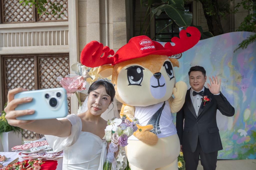 4月22日,在重庆市北碚区,参加集体婚礼的新人在活动现场自拍。新华社记者 黄伟 摄