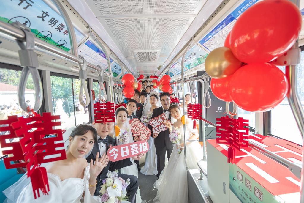 4月22日,在重庆市北碚区,参加集体婚礼的新人们乘坐公交车抵达活动现场。